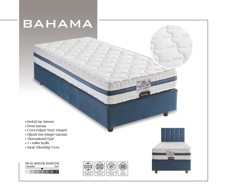 Bahama, yoğun kullanıma uygun yapısı, orta sertlik derecesi ve ortopedik destek sağlayan teknolojisiyle otel, yurt ve kurumsal projeler için ideal bir yatak çözümüdür. Misafir memnuniyetini artırırken işletmelere uzun ömürlü ve güvenilir bir kullanım sunmak üzere tasarlanmıştır.