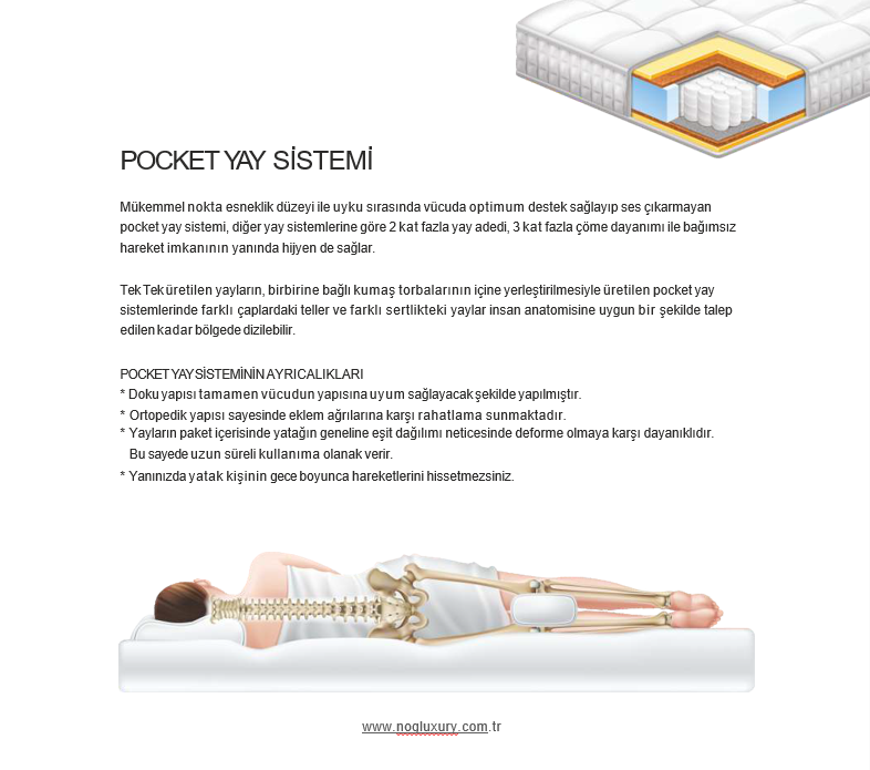 Paket Yay Sistemi, hareket izolasyonu sağlayarak sessiz ve kesintisiz bir uyku sunar. Pamuk saten kumaş, doğal ve pürüzsüz dokusuyla cilde nazik bir temas sağlarken; Hyper Soft yüzey süngeri ve extra soft sünger katmanları, vücuda uyum sağlayan yumuşak bir konfor hissi sunar.