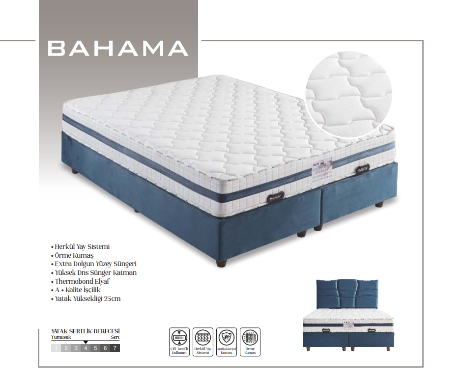 Bahama, yoğun kullanıma uygun yapısı, orta sertlik derecesi ve ortopedik destek sağlayan teknolojisiyle otel, yurt ve kurumsal projeler için ideal bir yatak çözümüdür. Misafir memnuniyetini artırırken işletmelere uzun ömürlü ve güvenilir bir kullanım sunmak üzere tasarlanmıştır.